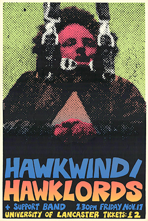 Previous Image Next Image Hawkwind / Hawklords Lancaster University gig poster Screenprint 20x30ins 1978 Based on a found newspaper photo