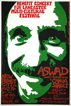 Previous Image Next Image Aswad + China Street Poster for gig by Aswad + China Street. Screenprint 20x30ins 1978 Based on a photo I took of a friend in Birmingham.