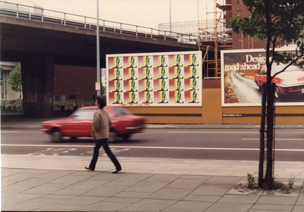 I was awarded a grant for public art by North West Arts Board (now Arts Council England, North West) in 1981. My proposal was for production of multiple screen-prints to be displayed on billboards in Manchester. Moore O’Ferrall supported the work by providing the sites and installation. I created two portraits and, as usual, screen-printed them all by hand, each sheet 30x40in. The two images were on display for one month each, on Oxford Road, Cheetham Hill Road, and in St Peter’s Square.