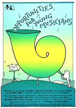 Previous Image Next Image Opportunities for Young Musicians 1988 (green) North West Arts : Young Chamber Musicians’ Platform Royal Northern College of Music 1988 Offset litho A3